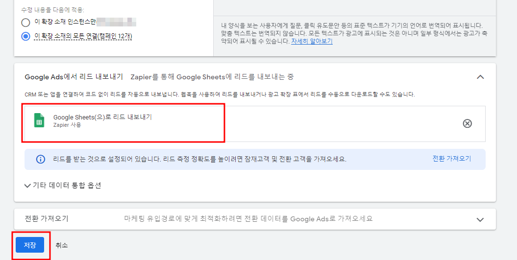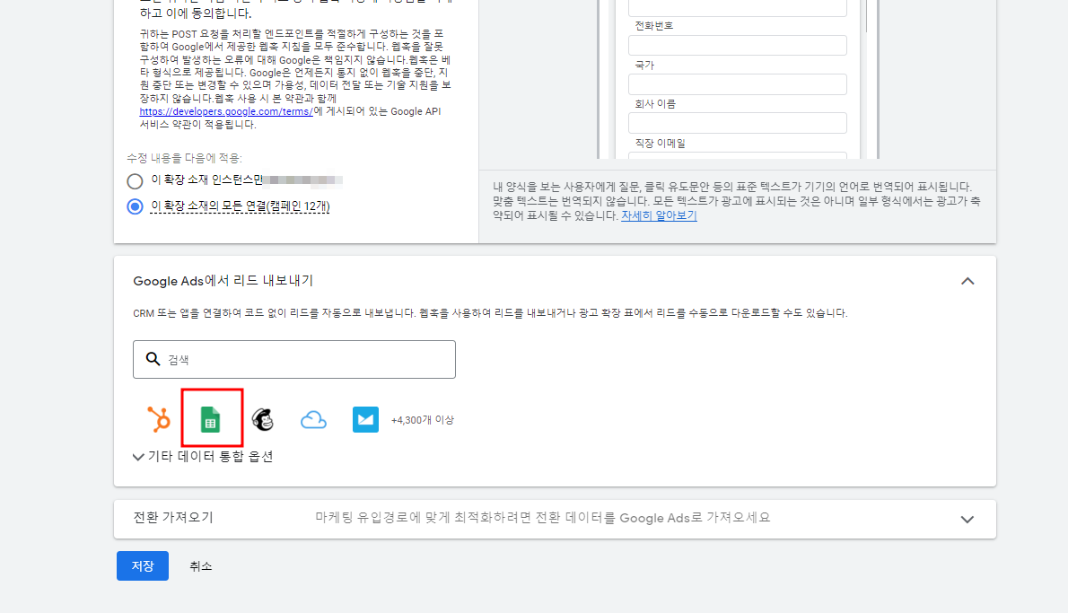 - 구글 애즈 리드 양식 제출한 고객들의 정보를 자동으로 구글 스프레드 시트에 연동하는 방법