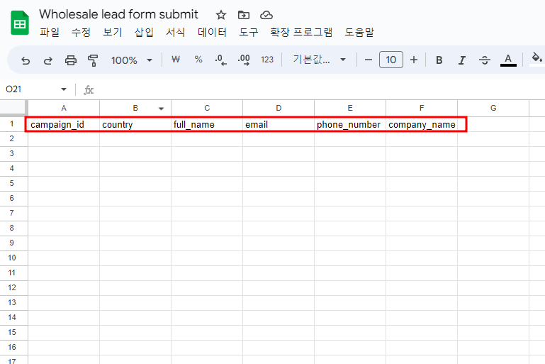 그러면 하기 캡쳐본과 같이 구글 스프레드시트에 만들어둔 컬럼명들이 나열 되는데,