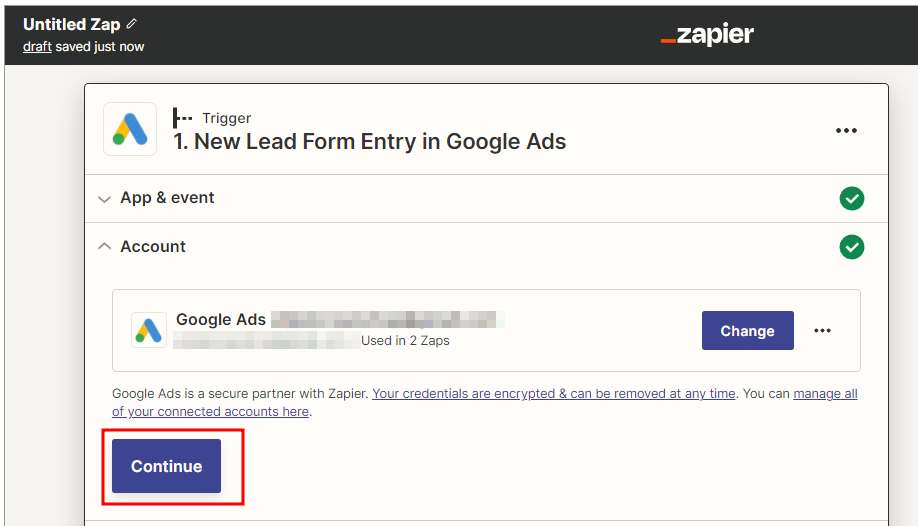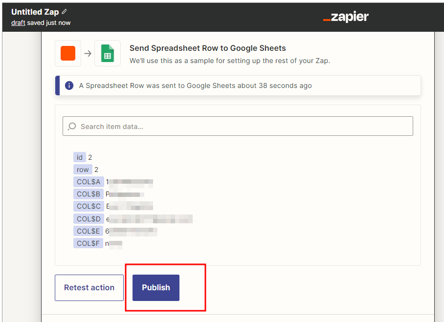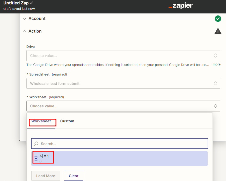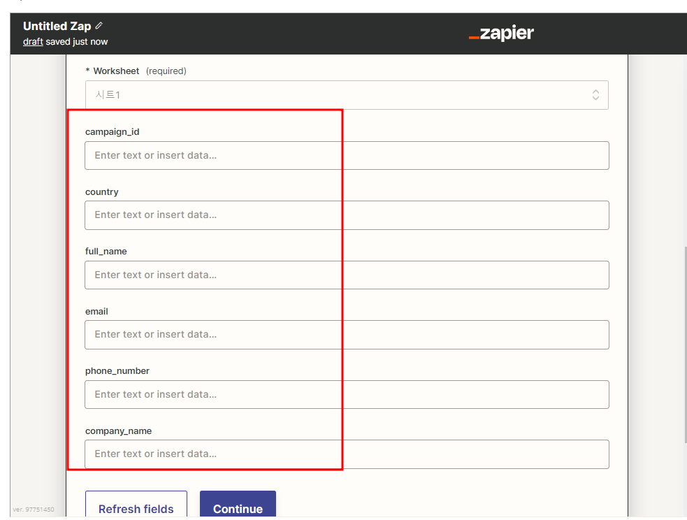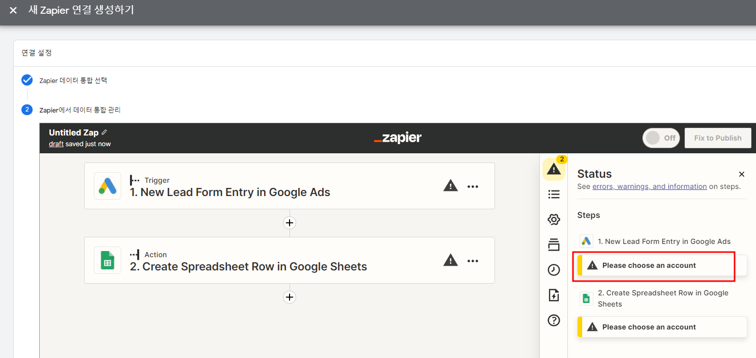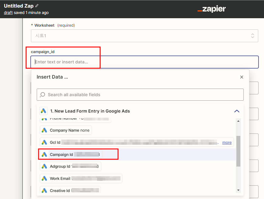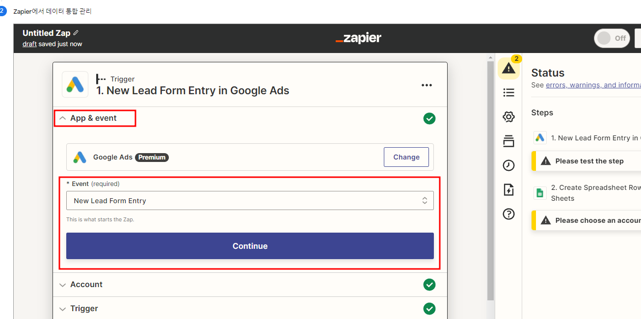 Zapier 를 이용한 Google Sheets 데이터 통합 생성 클릭