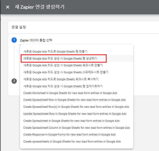 "새로운 Google Ads 리드 생성 시 Google Sheets 행 생성하기" 선택