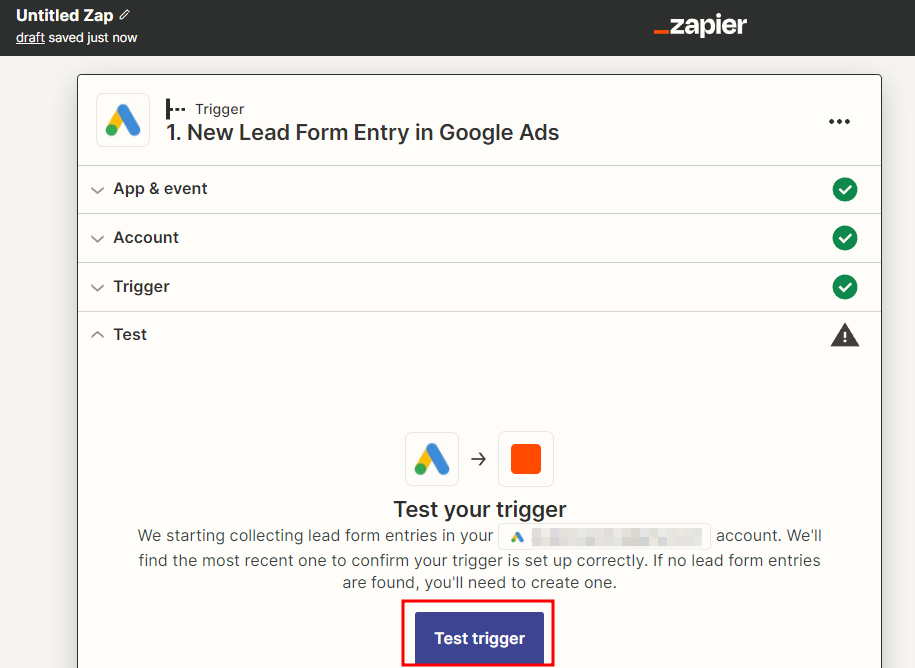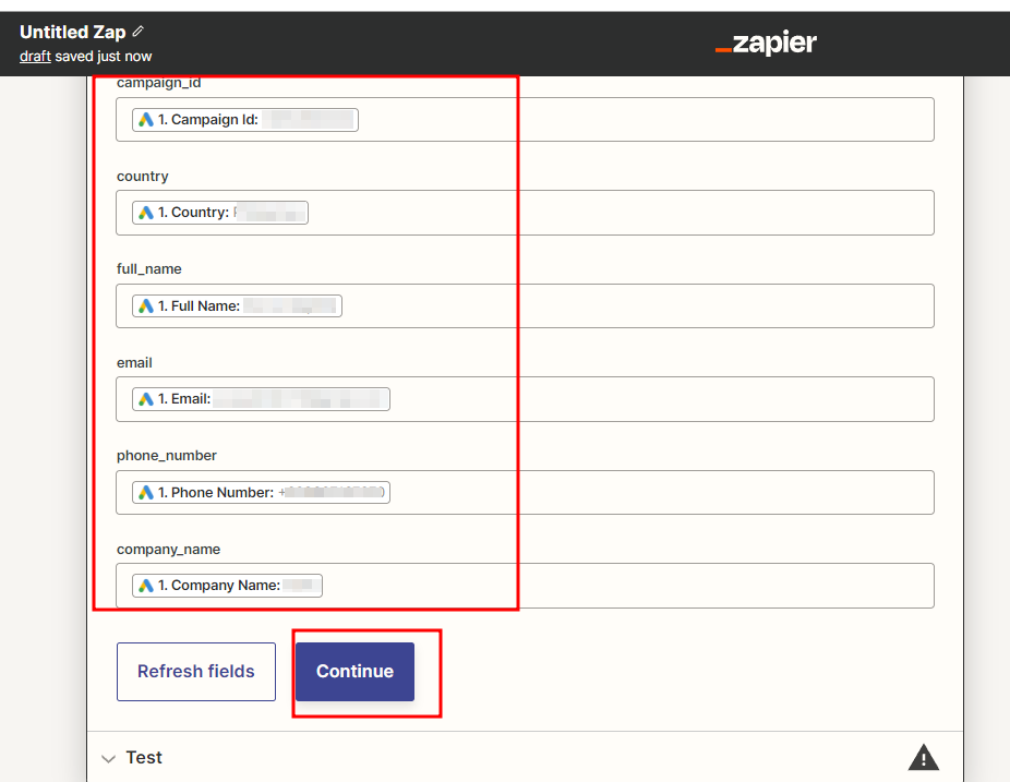 Test trigger 를 진행하면, 하기 캡쳐본과 같이 리드 폼 양식에서 받아오는 고객 데이터 필드를 보여준다.