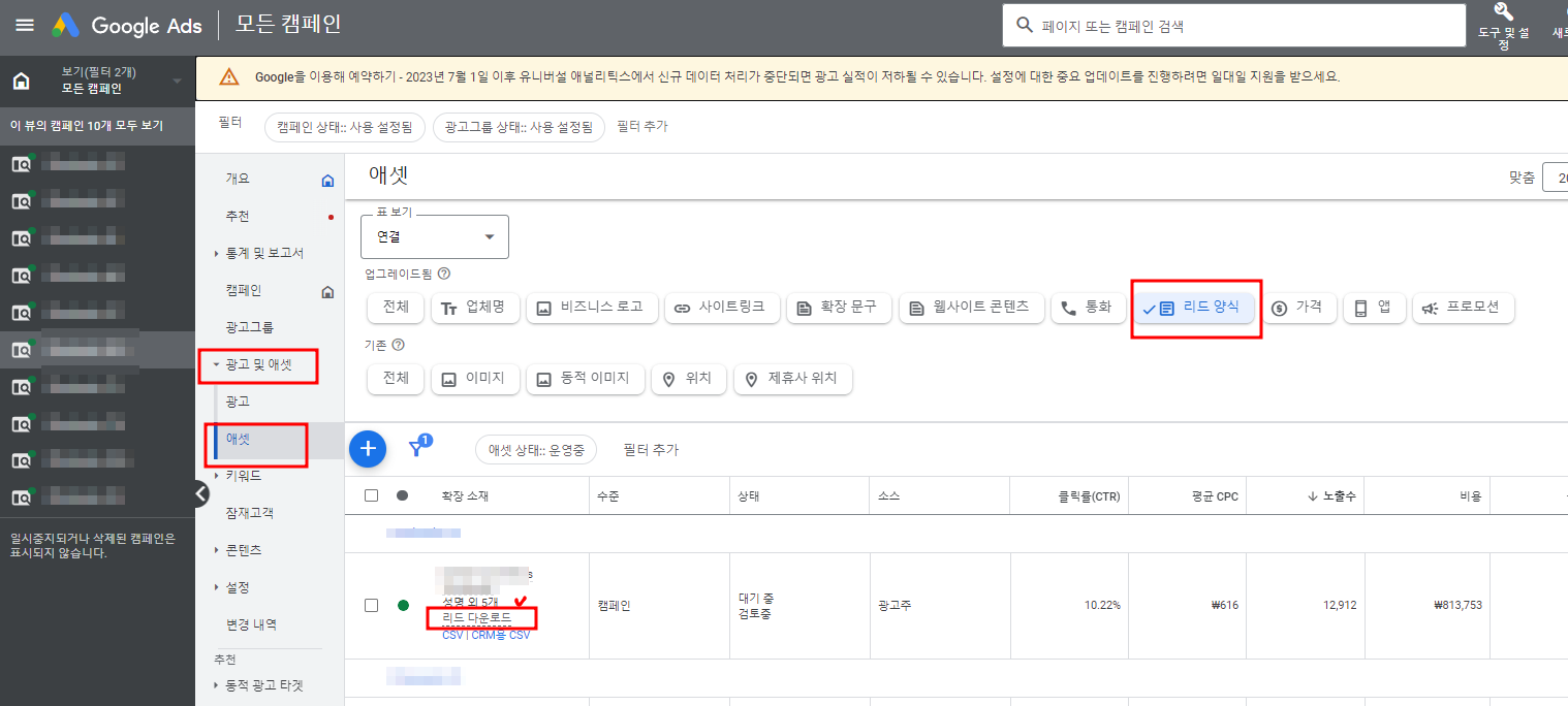구글애즈 계정 (광고계정 아이디), 리드폼 애셋 연동 하기