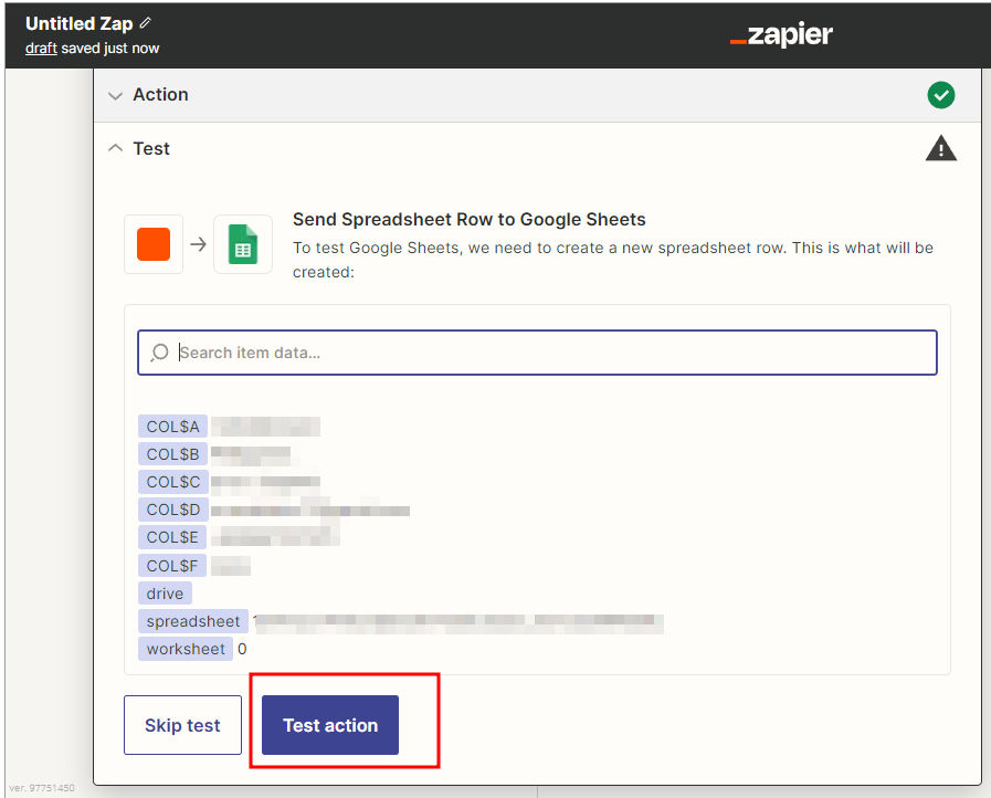Test action 버튼을 누르면 우리가 만들어 둔 구글스프레드 시트에 test 데이터가 한 행 들어온다