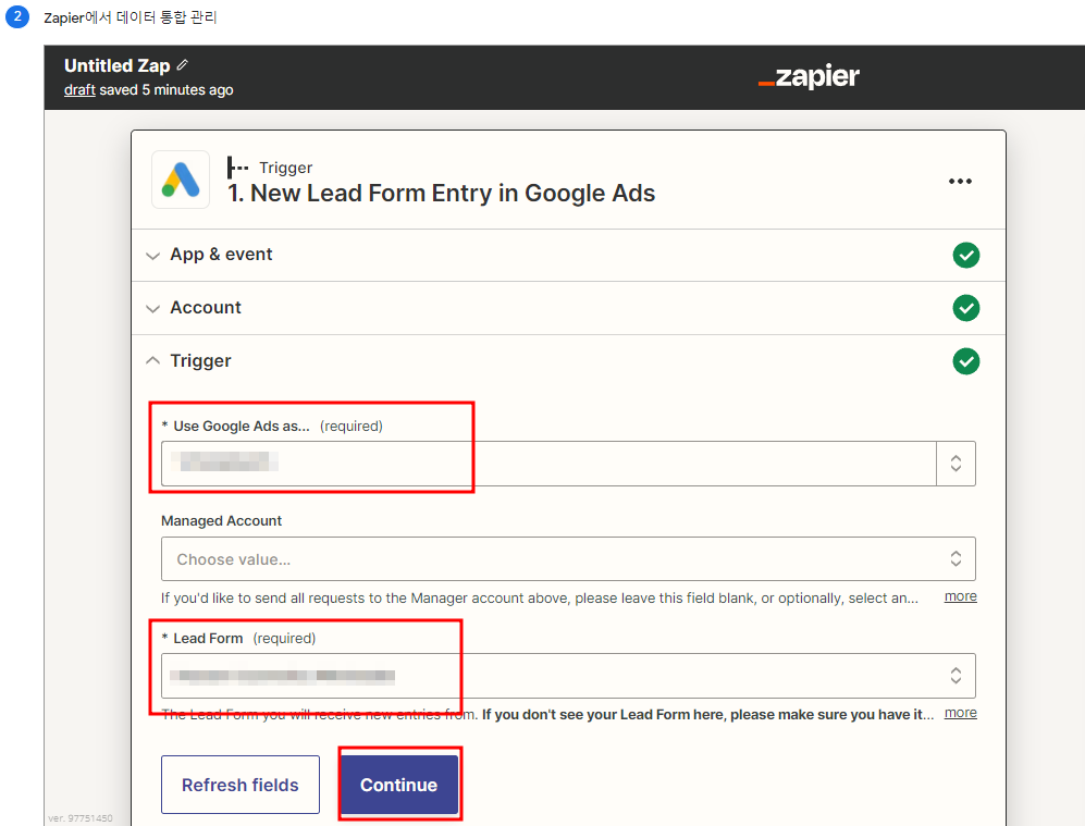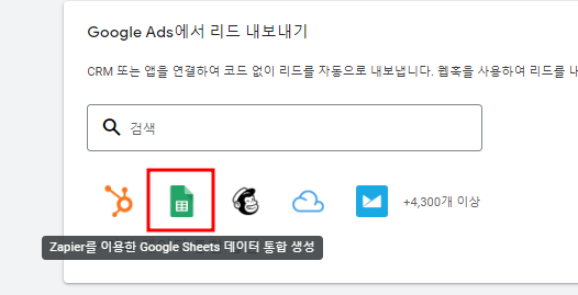 하기와 같이 구글 시트로 리드 내보내기 (Zapier 사용) 문구가 생성 되면
