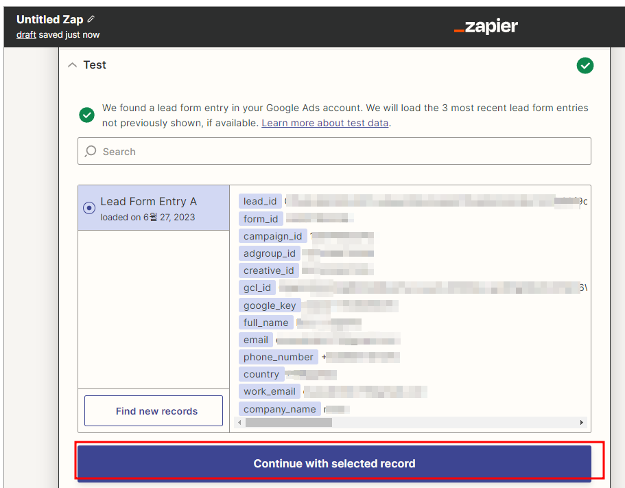 그런 다음 다시 Zapier 구성 화면으로 돌아와서 Continue with selected record 버튼을 누른다