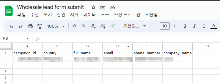 이제 리드 양식이 제출 될 때마다 구글 스프레드시트에 자동으로 한 행씩 입력되는 것을 확인 하면 된다 :)