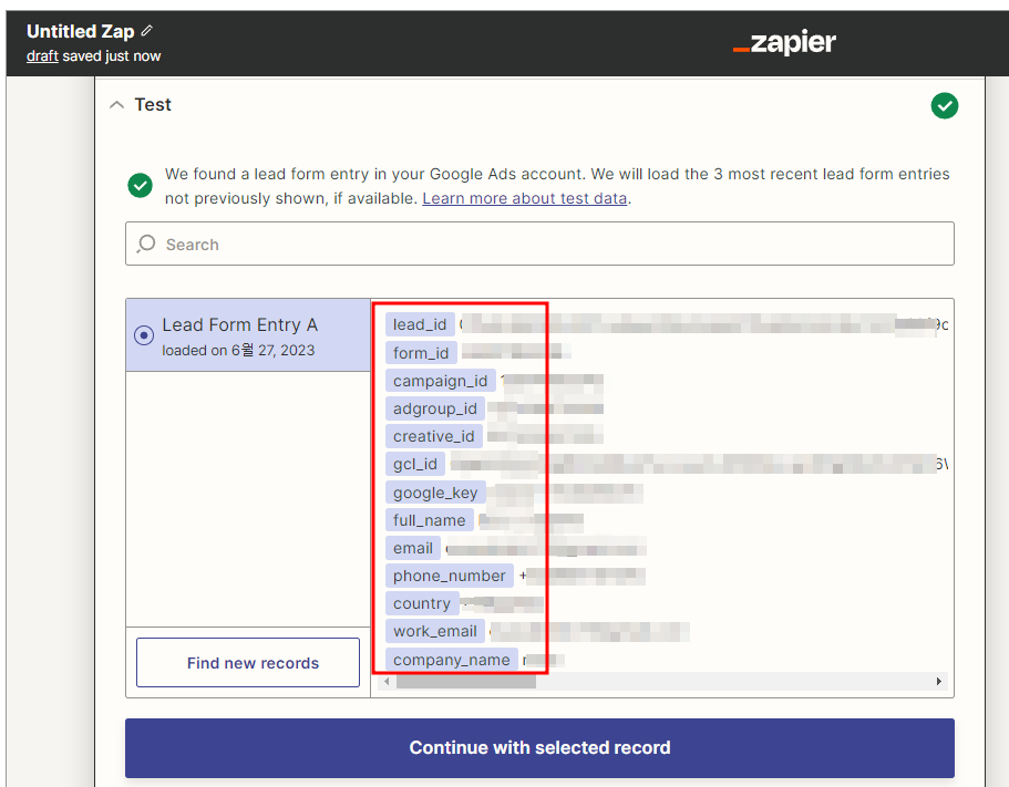 그런 다음 다시 Zapier 구성 화면으로 돌아와서 Continue with selected record 버튼을 누른다