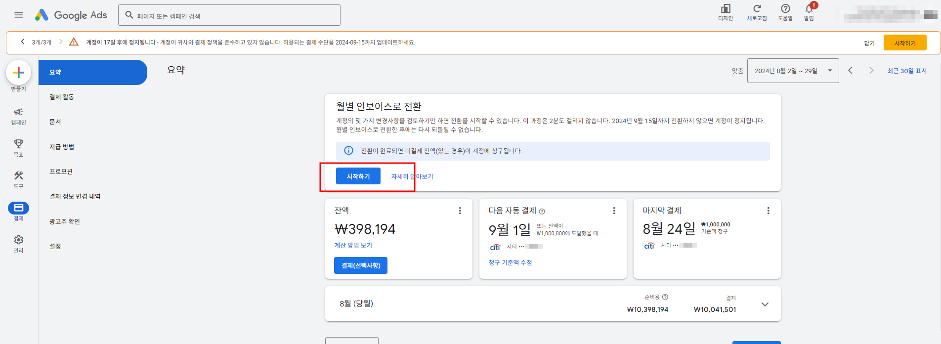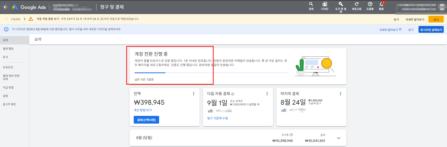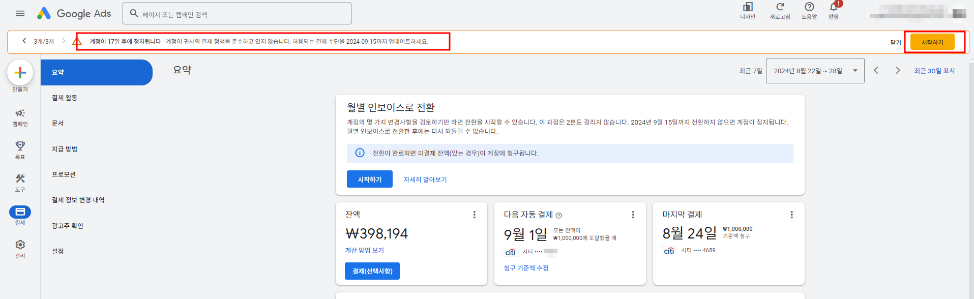 구글애즈 결제정책 변경으로, 아래와 같은 강제적 메세지가 뜹니다.