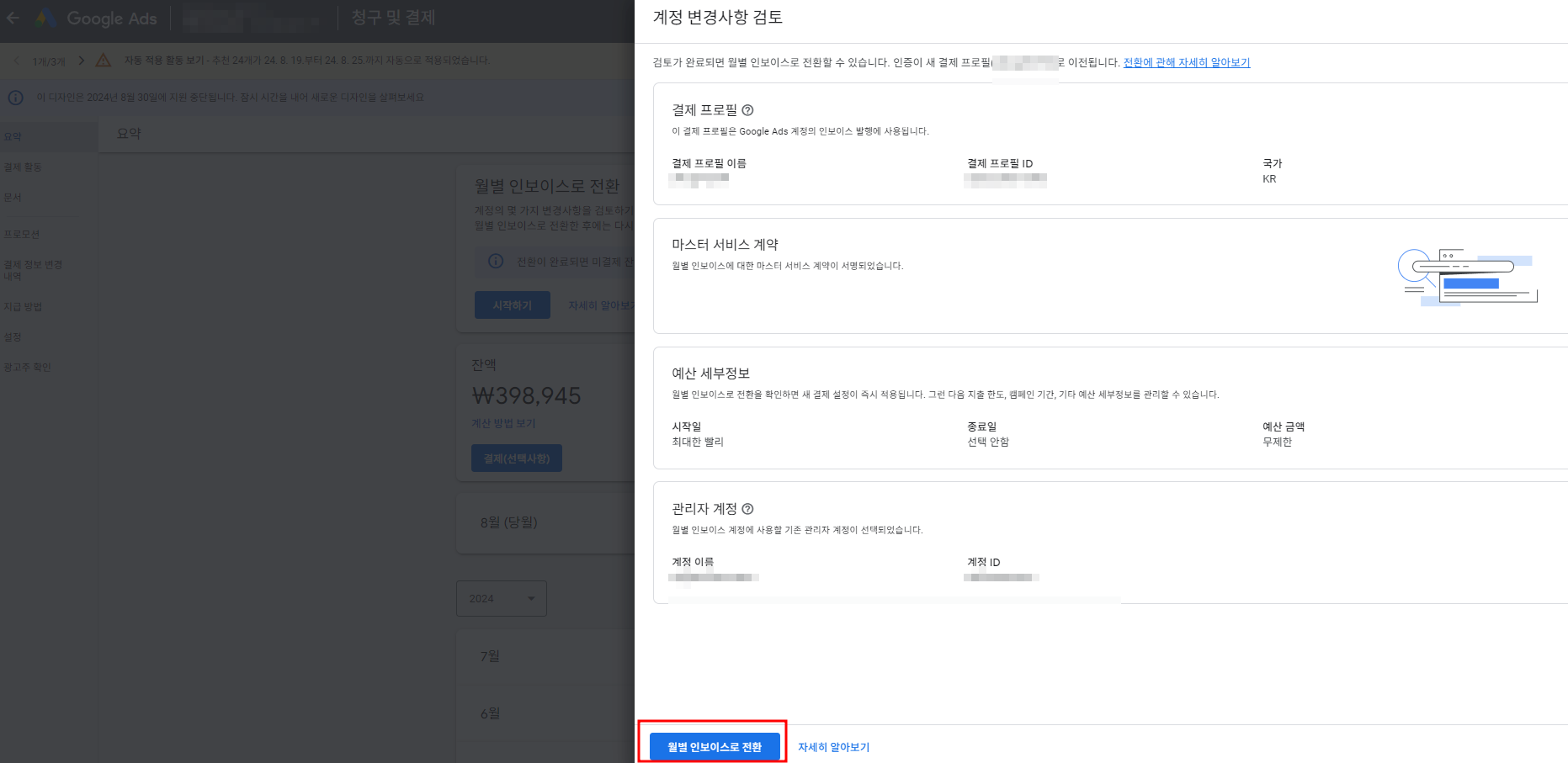'월별 인보이스로 전환' 버튼을 누르면 몇 초 동안 "계정 전환 진행 중" 상태였다가 완료 됩니다.