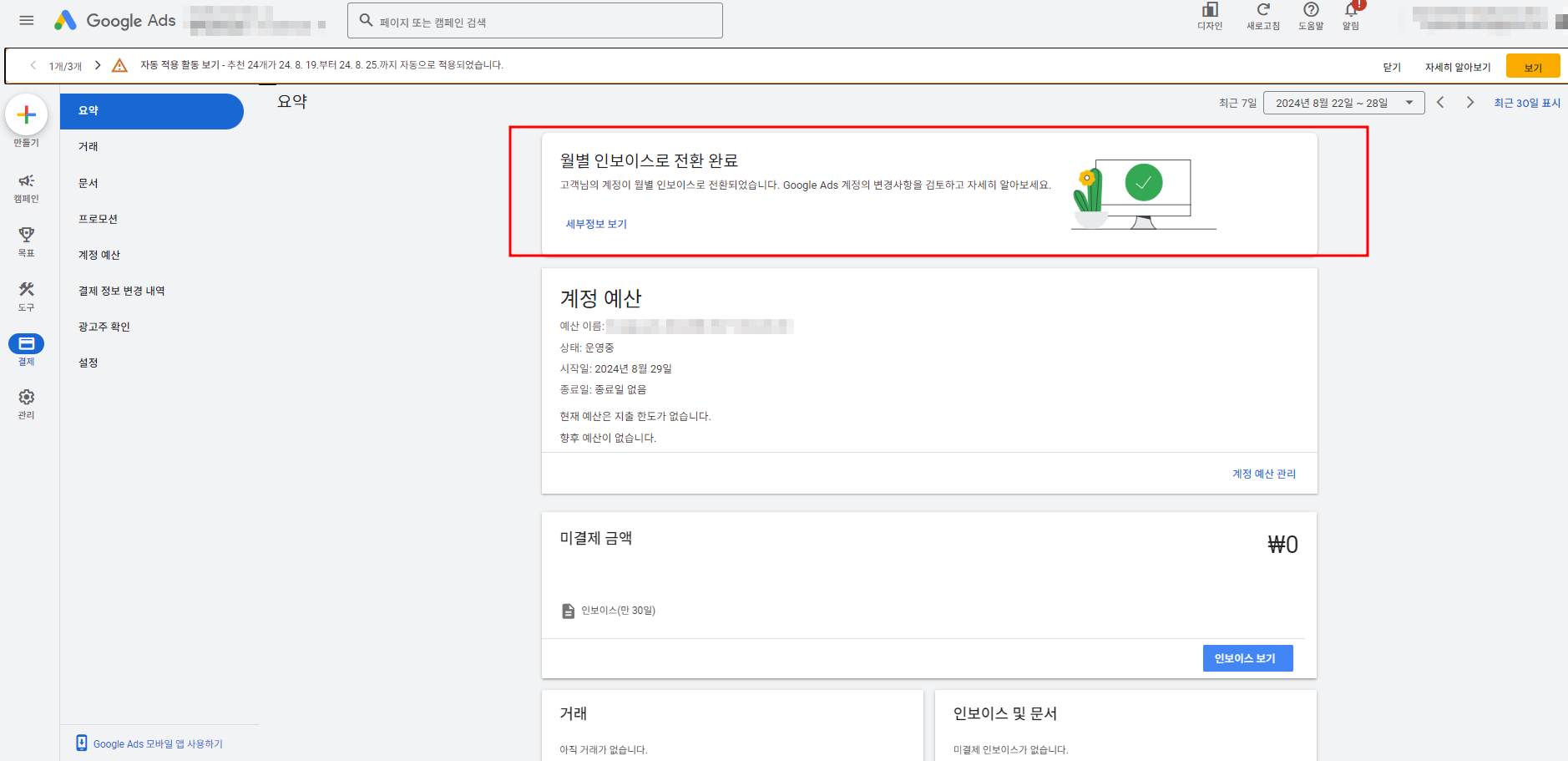 시간이 흘러 흘러 적용이 완료 되면 , 결제 페이지에서 아래 사진과 같이 '월별 인보이스로 전환' 화면이 뜨게 됩니다.