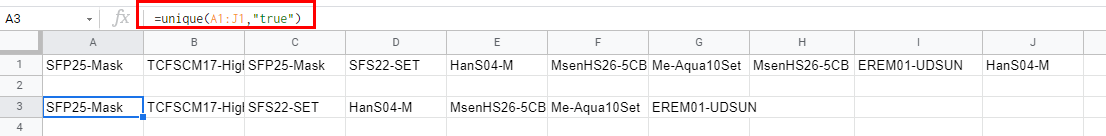 =unique(A1:J1 범위에서 중복제거해, (열 데이터 중복 제거 할거니까 비워두면 됨) ,중복이 없는 항목만 골라서 반환해)