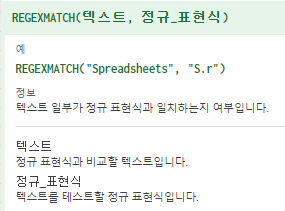 REGEXMATCH 함수는 텍스트 일부가 정규표현식과 일치하는지 TRUE, FALSE 로 여부 알려주는 함수다