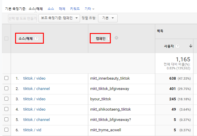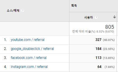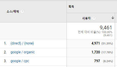 위에 집계된 대부분의 소스/매체는 구글 애널리틱스에서 자동으로 취합해 주는 지표들이다.