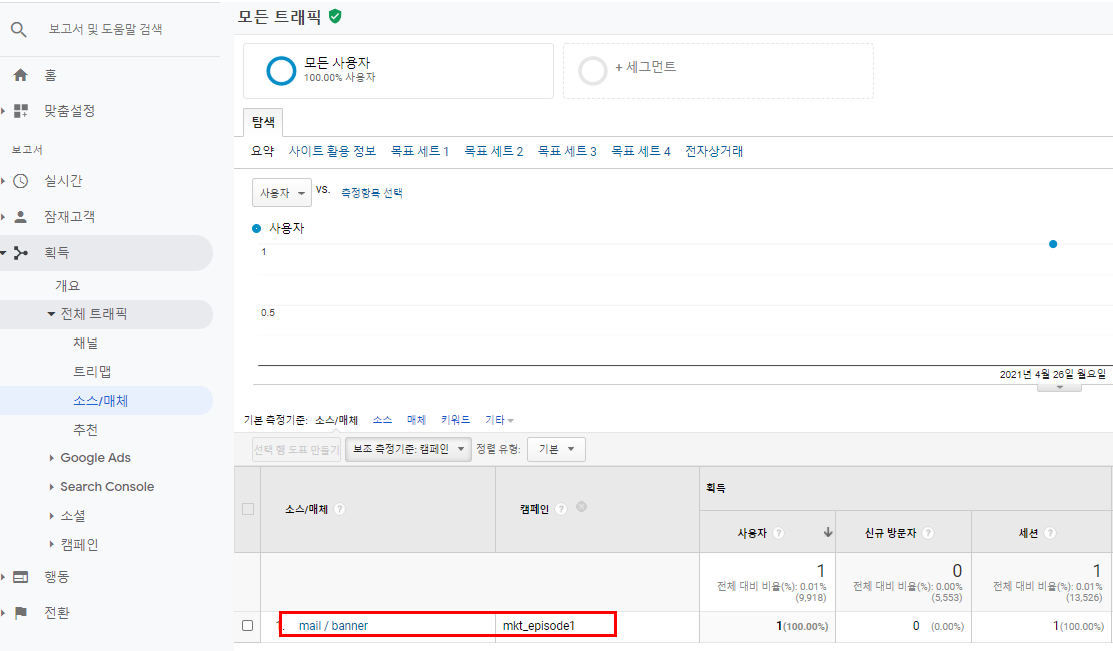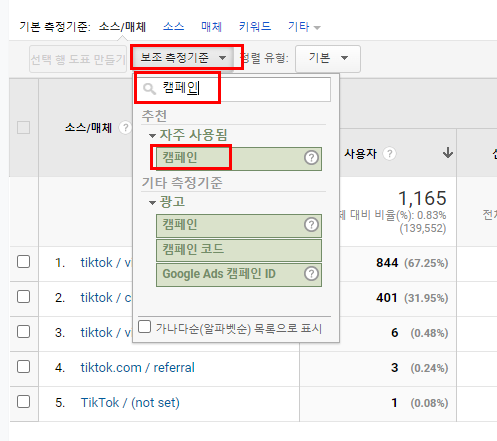 획득 -> 전체 트래픽 -> 소스/매체 에서 보조측정기준에 캠페인을 추가해서 한 화면에서 확인 가능하다.