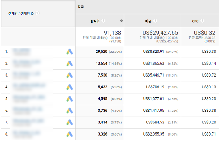 애널리틱스 -> 획득 -> Google Ads -> 캠페인 에서는 현재 내가 운영중인 구글애즈 캠페인들 통해 유입된 데이터를 보여준다. (구글애즈와 구글애널리틱스 연동해야 보임)
