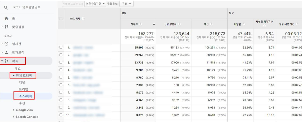 5. 필터 입력란에서 '캠페인 소스' 선택
