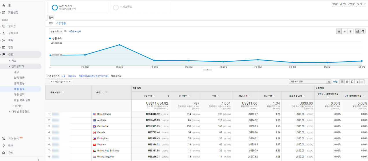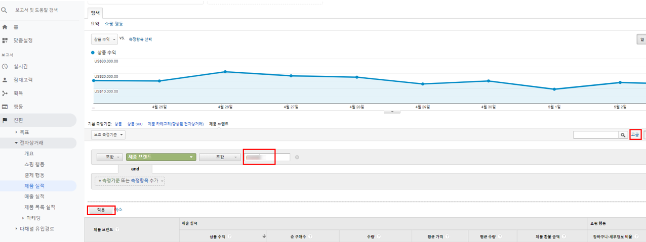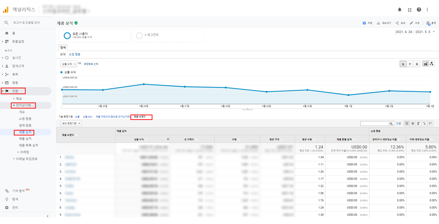 구글 애널리틱스 -> 전환 -> 제품실적 -> 브랜드