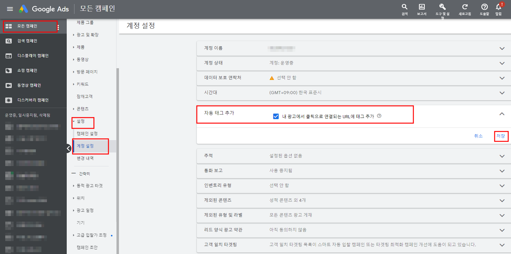 모든캠페인 -> 설정 -> 계정설정 -> 자동 태그 추가