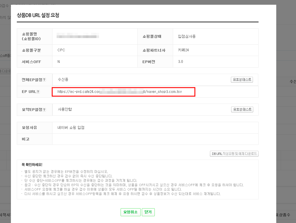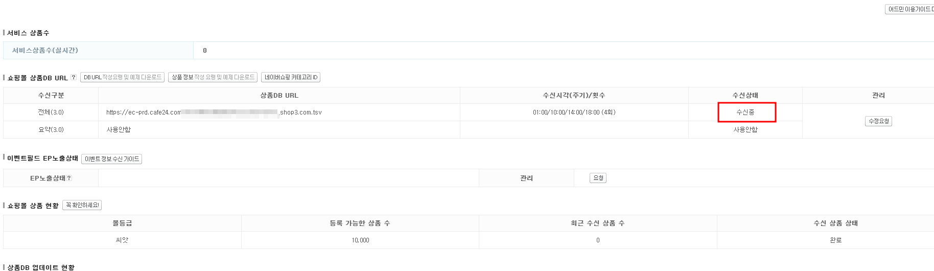 아래 캡쳐본 에서 쇼핑몰 상품 DB URL 등록 요청 쪽에 '요청하기' 버튼 눌러 주세요