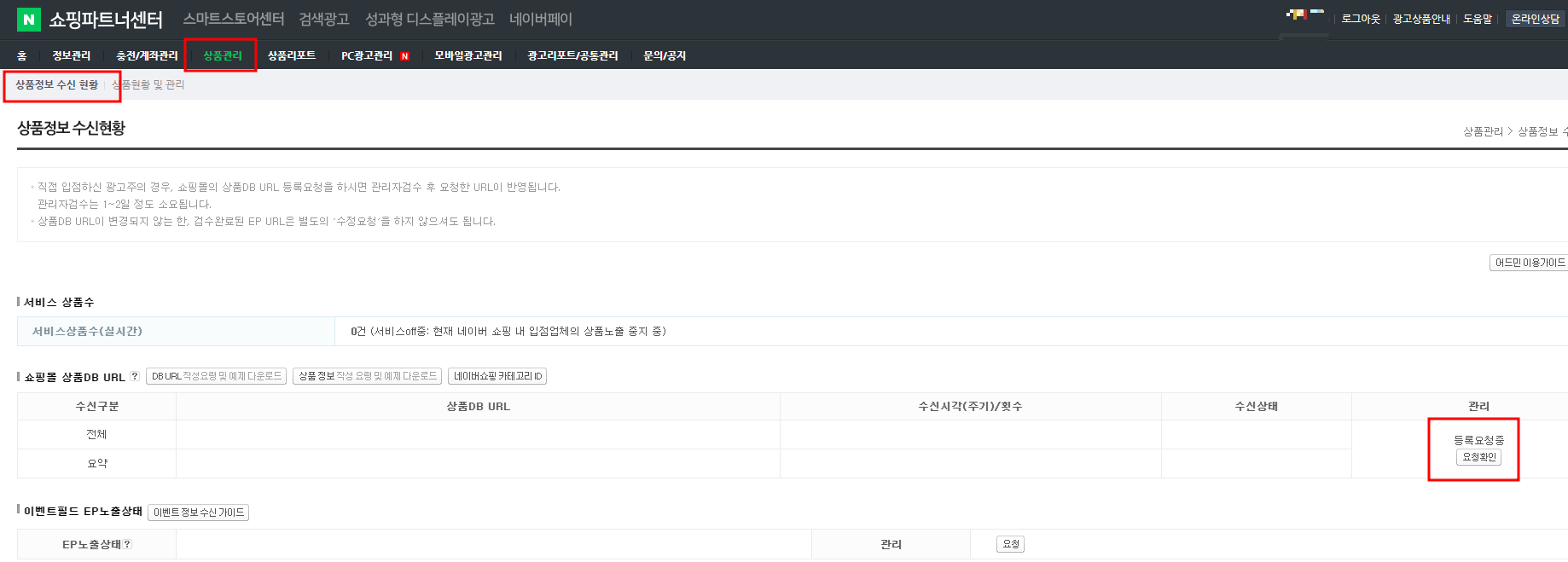 네이버 쇼핑 → 상품관리 → 상품정보 수신 현황