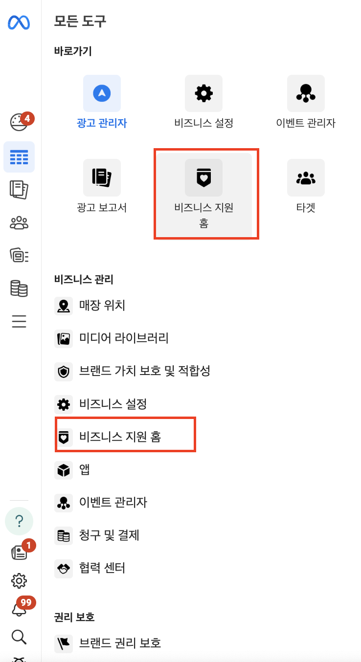 메타 비즈니스 관리자 화면으로 가서 '비즈니스 지원 홈' 메뉴로 들어갑니다