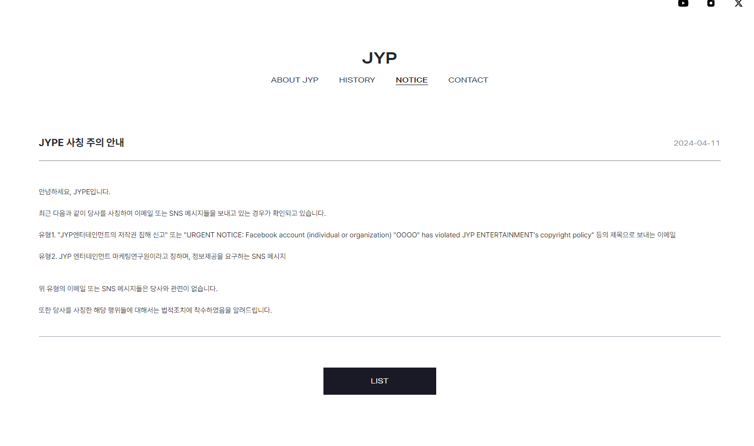 JYP 엔터테인먼트를 사칭해서 스팸 메일을 보내기도 합니다. 메일에 첨부된 파일을 절대 다운로드 하시면 안됩니다.