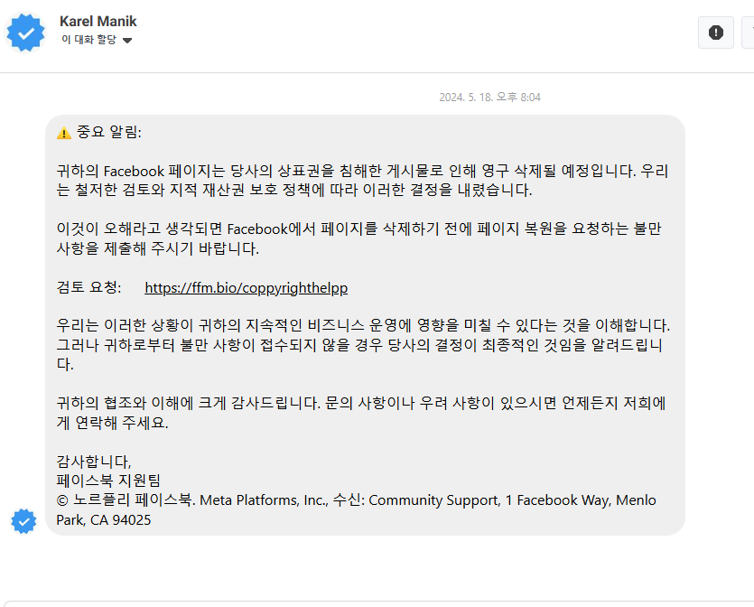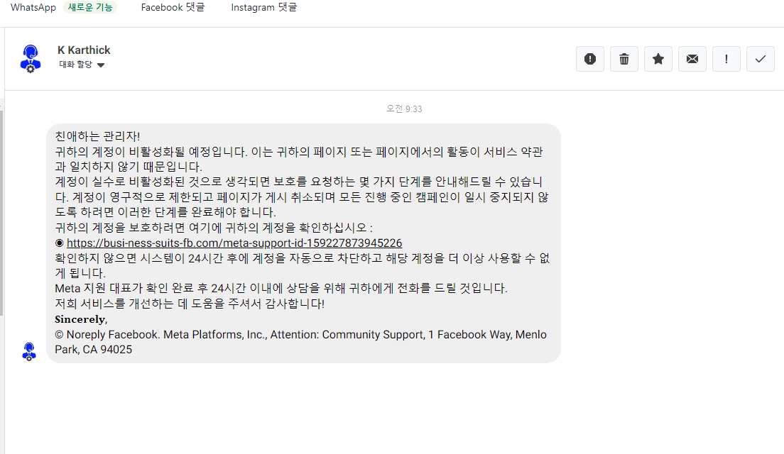메타 페이스북 광고 계정을 운영하다 보면, 스팸 메세지나 스팸 메일이 종종 옵니다. 처음 받아보시는 분들은 스팸인지 알아보기 너무 어렵습니다. UI 를 진짜 정교하게 만들어놓고 개인정보 제출을 유도합니다. 버튼 색깔, 메일주소 등등 정교하게 메타를 따라해놨습니다.