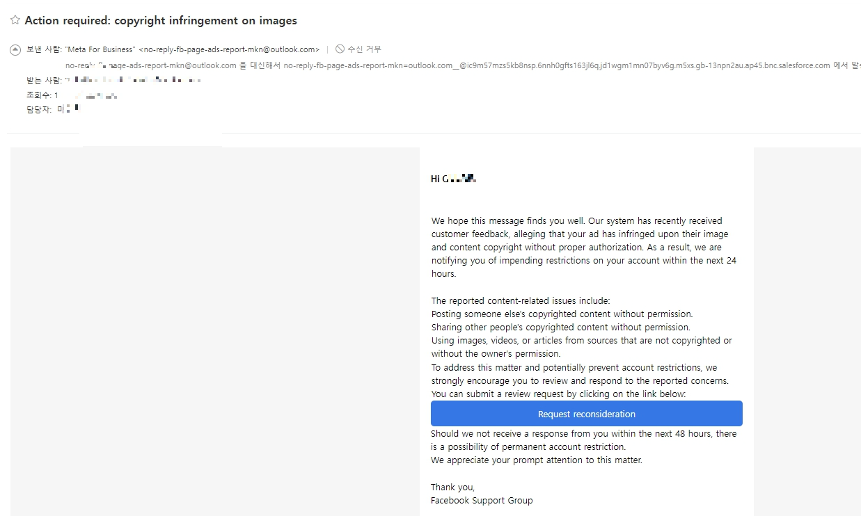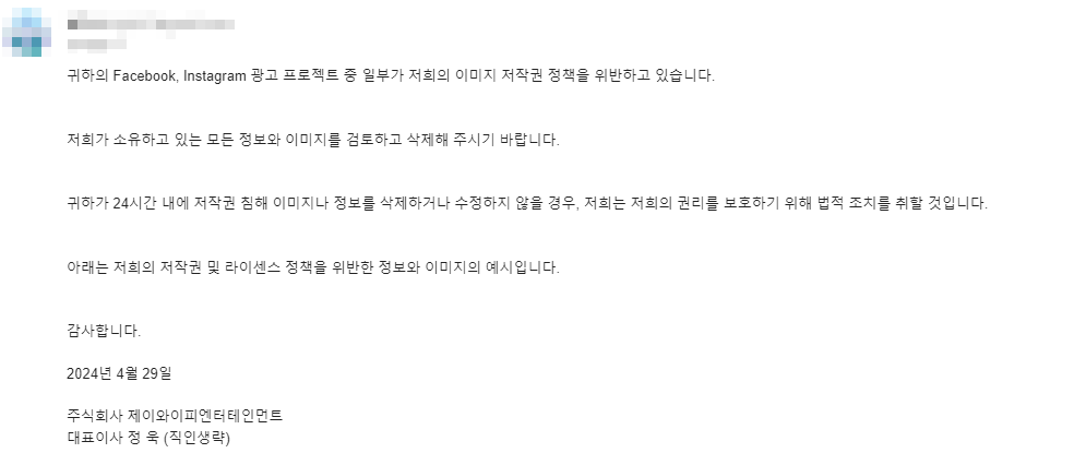 귀하의 Facebook, Instagram 광고 프로젝트 중 일부가 저희의 이미지 저작권 정책을 위반하고 있습니다.