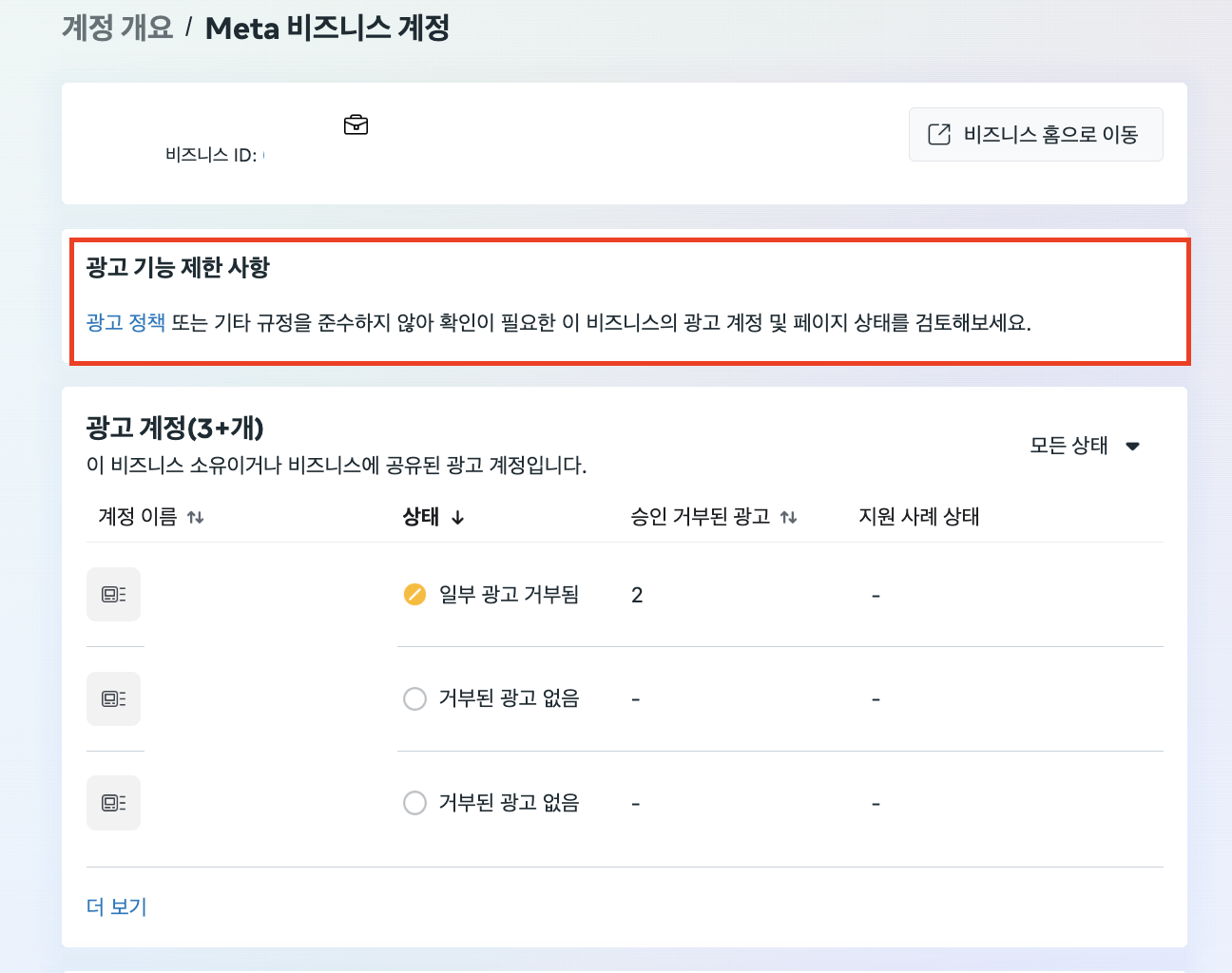 메타 비즈니스 관리자 화면으로 가서 '비즈니스 지원 홈' 메뉴로 들어갑니다