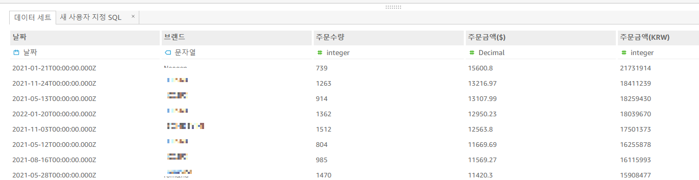 퀵사이트에서 위 쿼리문과 같은 내용으로 데이터세트 생성하면 아래와 같은 결과가 나옴