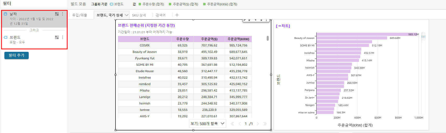 퀵사이트에서 (Amazon QuickSight) 브랜드 판매순위 표 만드는 방법