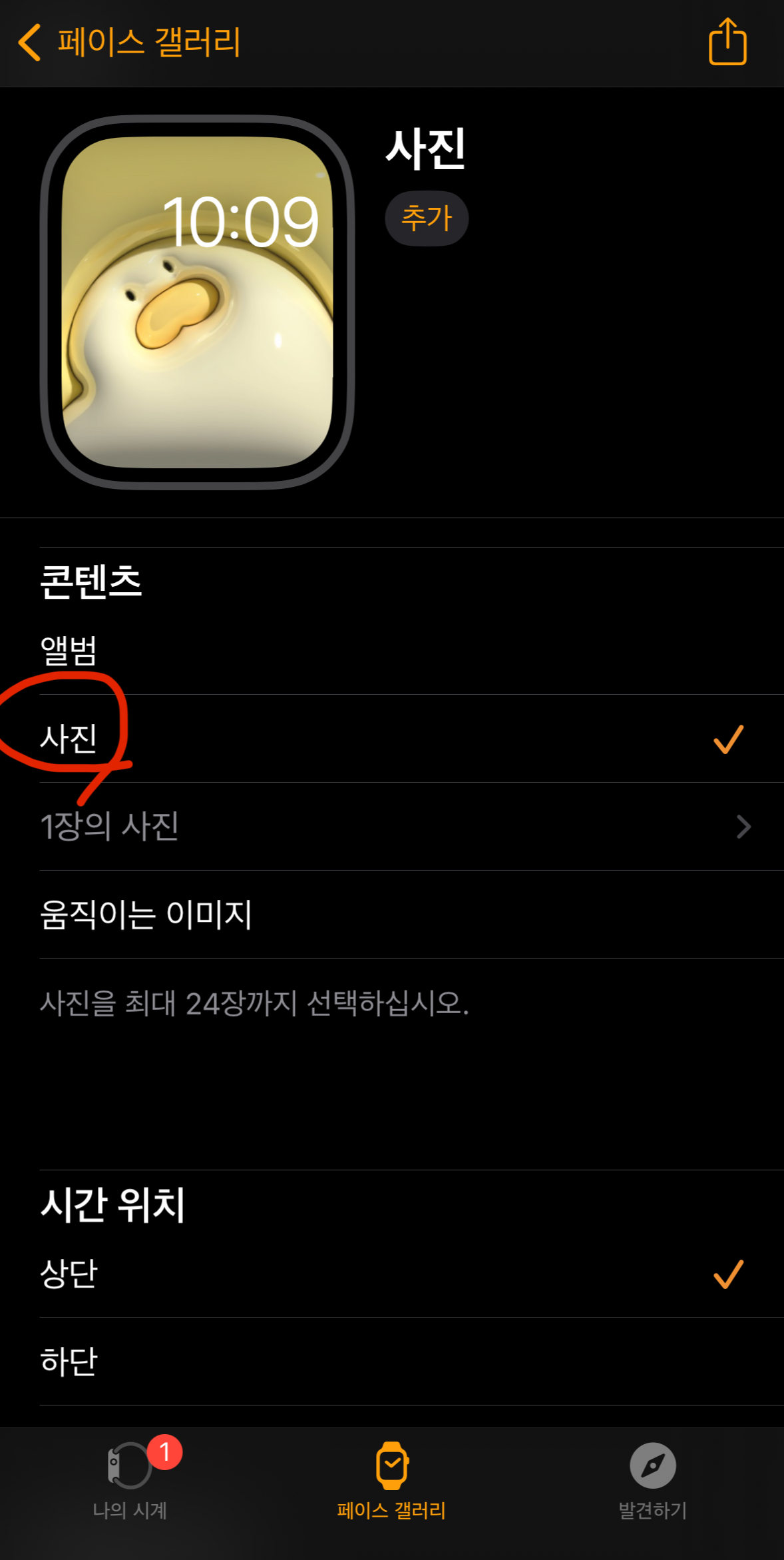 4. 위에서 사진을 몇개 선택했다면 아래 캡쳐본 처럼 '추가' 버튼을 눌러줍니다. 그러면 비로소 '나의 시계' '페이스 갤러리에 이 배경화면이 추가 된 것입니다.