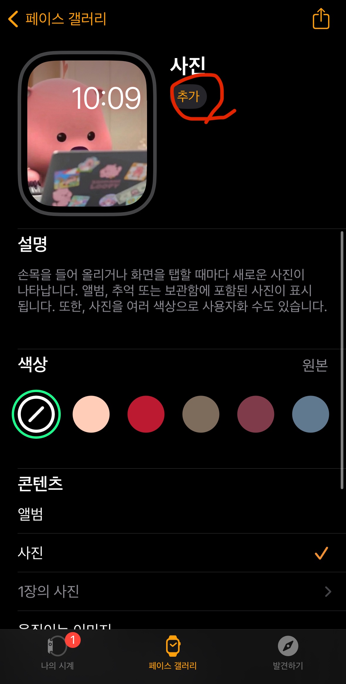 4. 위에서 사진을 몇개 선택했다면 아래 캡쳐본 처럼 '추가' 버튼을 눌러줍니다. 그러면 비로소 '나의 시계' '페이스 갤러리에 이 배경화면이 추가 된 것입니다.