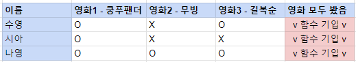 if 함수와 and 함수를 중첩 사용해서 사람들이 영화 3편을 모두 다 봤는지 체크하는 함수를 기입해주세요