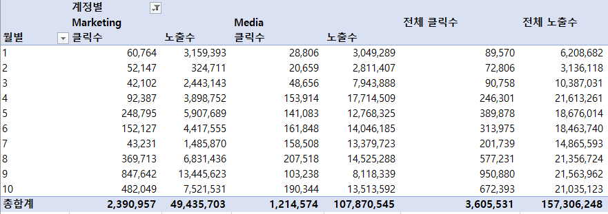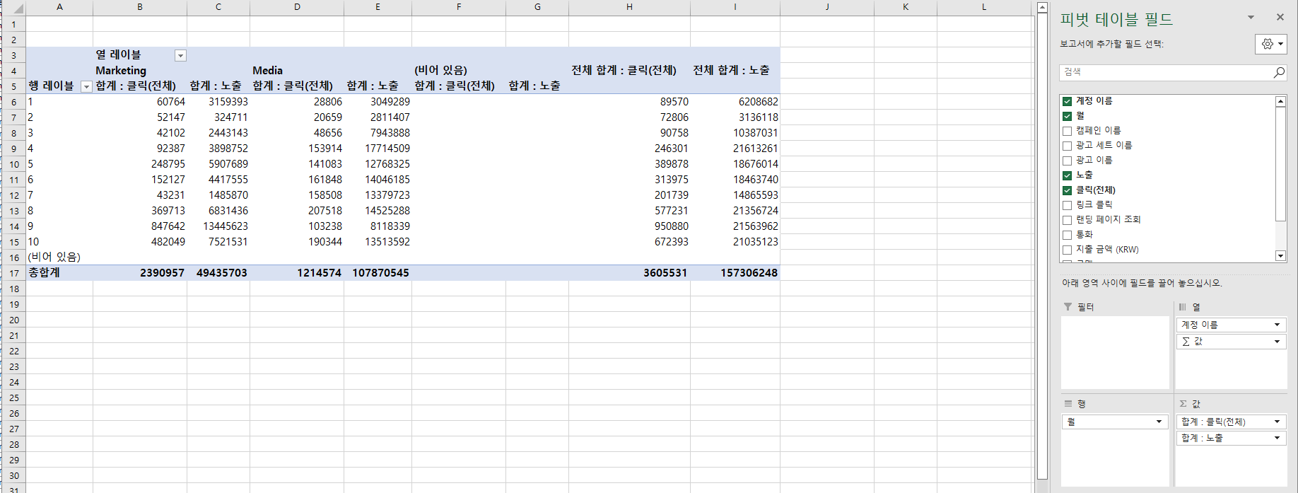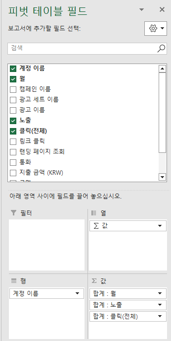 피벗 테이블 필드에서 계정이름, 월, 노출, 클릭 필드를 선택해 준다.