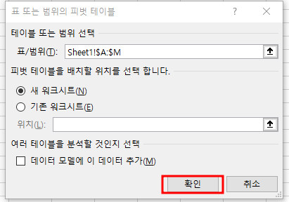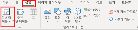 메뉴에 삽입 -> 피벗 테이블 클릭