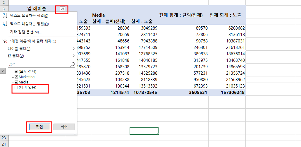 열 레이블 필터에서 "비어 있음"을 제외 시킨다