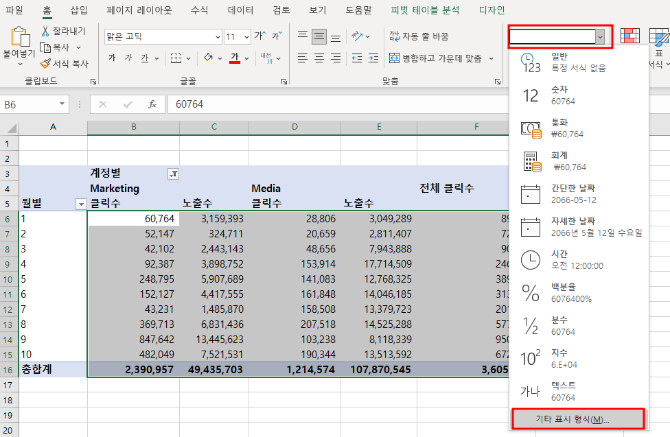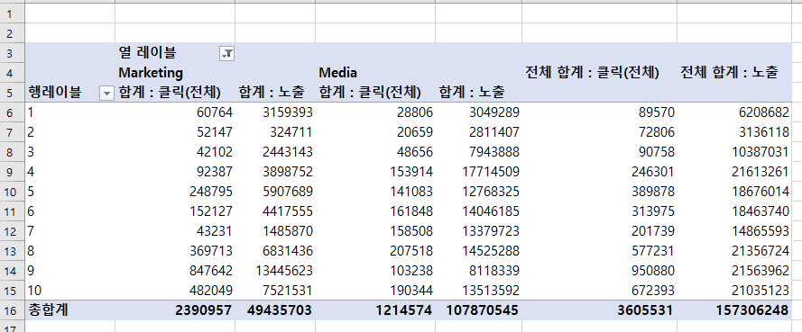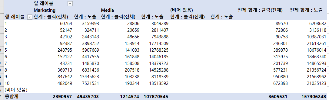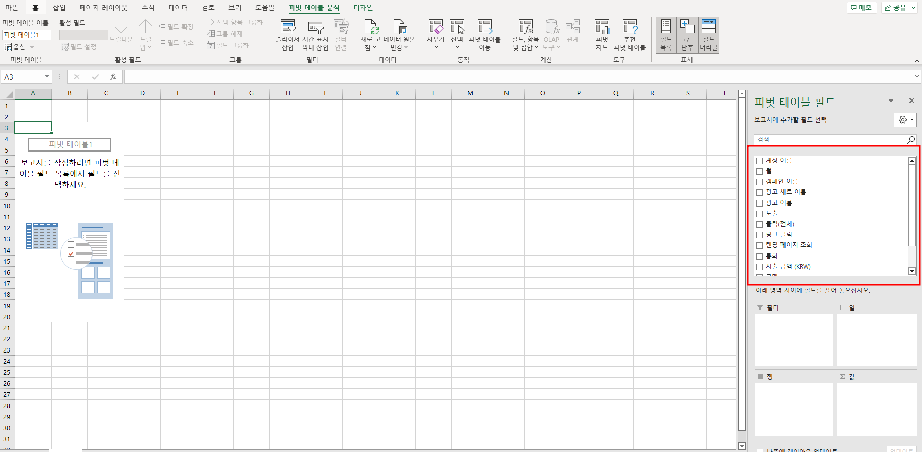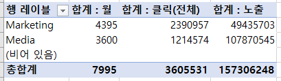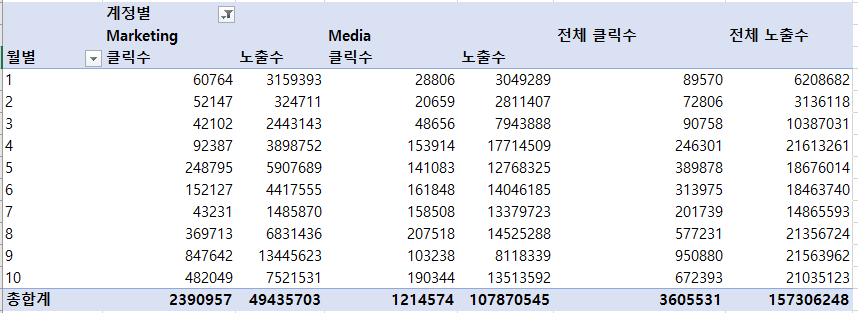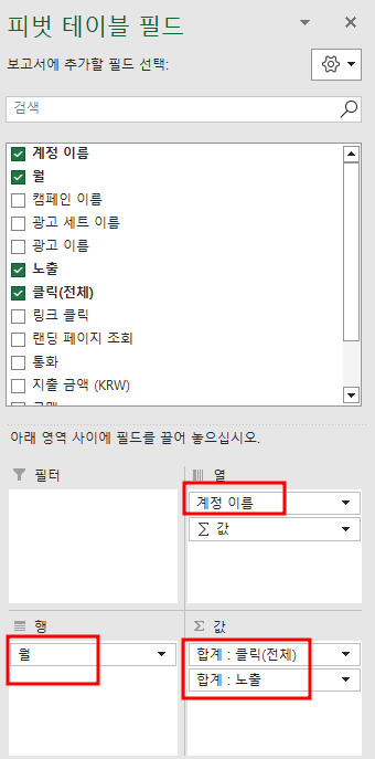 피벗 테이블 필드에서 계정이름, 월, 노출, 클릭 필드를 선택해 준다.
