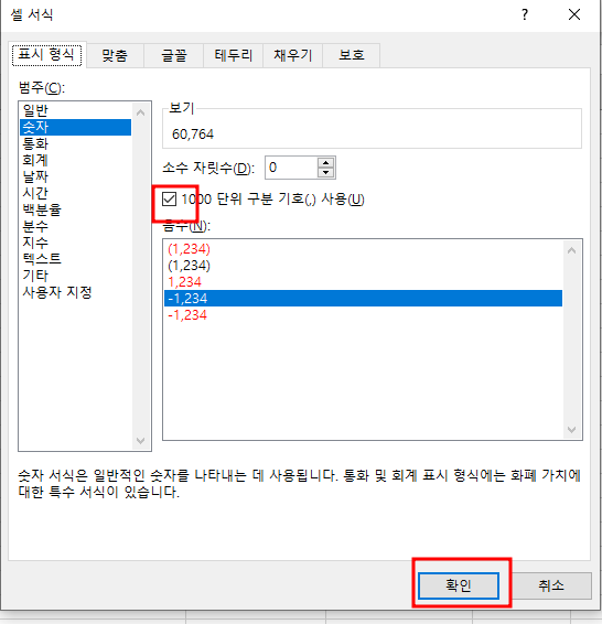 그런 다음 숫자 서식으로 세 자릿수 마다 콤마(,) 찍도록 설정해준다