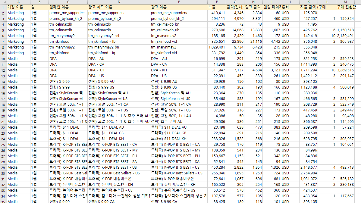 이 데이터를 계정이름별, 월별로 노출, 클릭을 집계하고 싶다면 ?