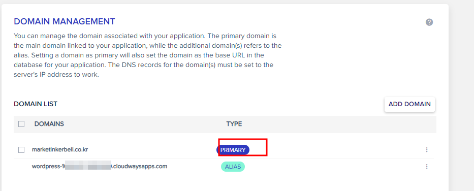 추가된 도메인을 PRIMARY 로 바꿔주기 위해서 (메인 도메인 주소로 설정해주는 것) 방금 추가한 도메인을 선택 해주고 오른쪽에 점 세개를 누른 후 Make Primary 클릭
