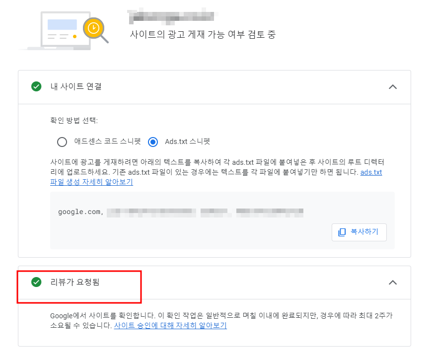 이 작업을 모두 진행 한 후에 구글 애드센스에서 "검토 요청" 을 누르고 몇 일 대기하면 승인이 완료 됩니다.