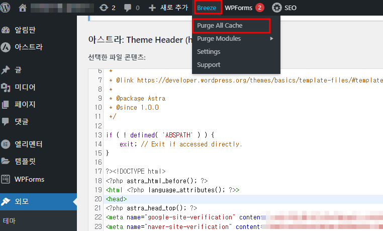 워드프레스 관리자 화면에서 메뉴 '외모' → '테마파일 편집기' → 우측 테마파일 들 중 'Theme Header (header.php)' 클릭