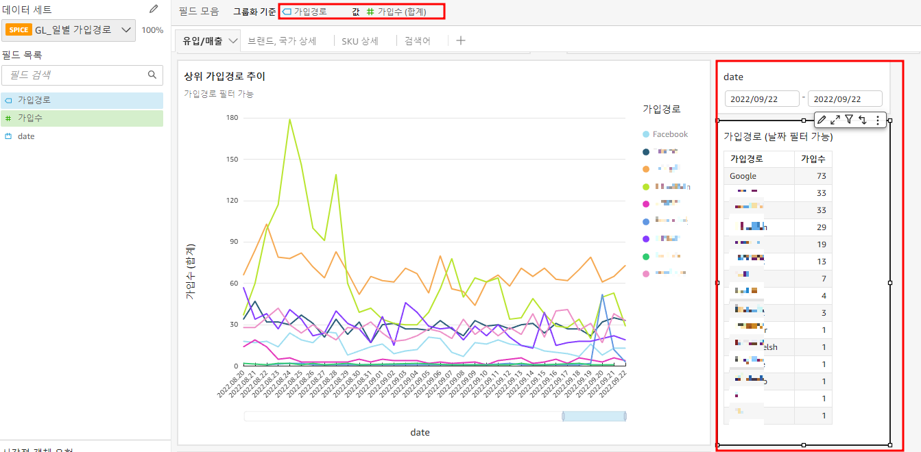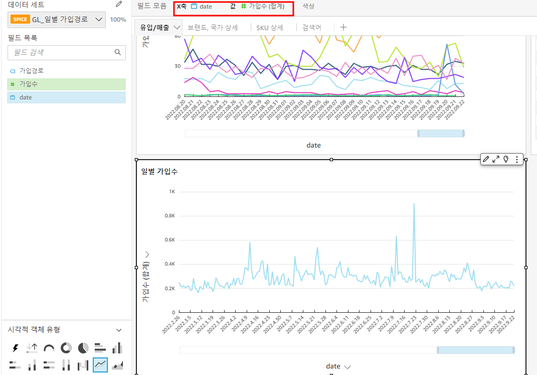 ㄴ x축은 "날짜" 선택, 값 필드엔 "가입수" 선택, 색상엔 "가입경로" 선택