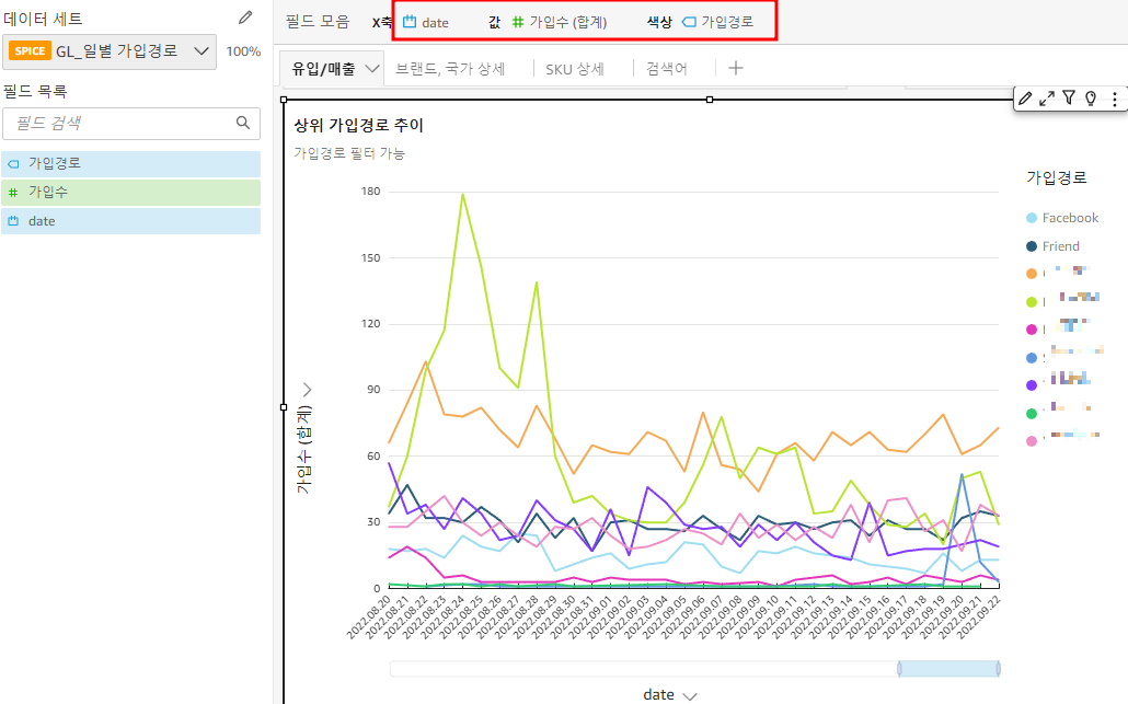 ㄴ x축은 "날짜" 선택, 값 필드엔 "가입수" 선택, 색상엔 "가입경로" 선택