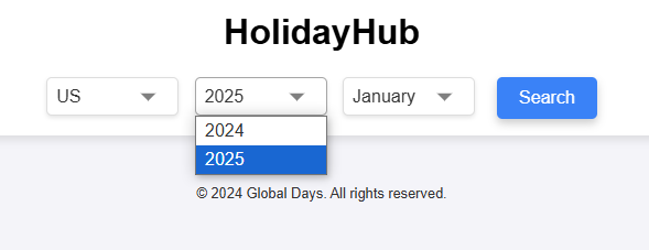 국가를 선택한 후 , 년도와 월을 선택하구 Search 버튼을 누르면 해당 되는 공휴일이 촤르륵~ 나옵니다 !