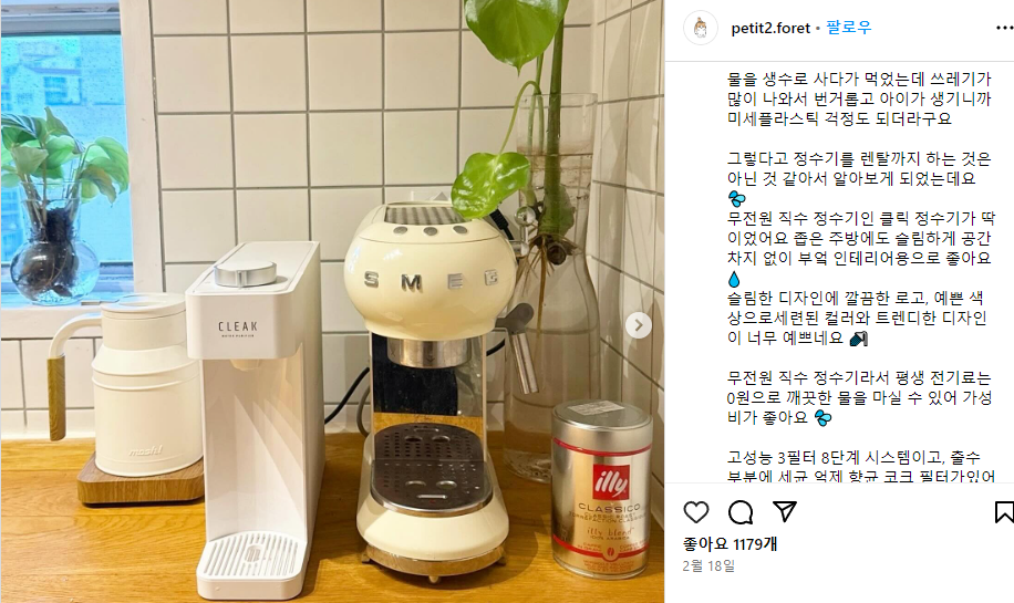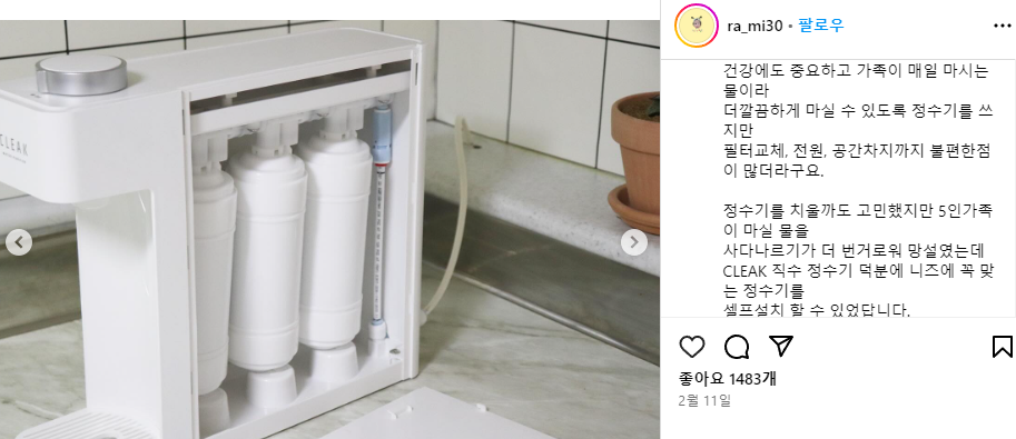 정수기 고민 중이시라면 직수 정수기, 그 중에서도 가성비가 좋고 제품 유지 보수가 편리한 클릭 정수기 추천합니다👍