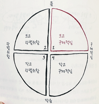 큰 것이 위험할 수 있고 위험한 것이 클 수도 있지만, 그 둘은 동일한 단어가 아닐 뿐더러 연관되어 있는 단어도 아니다. 큰 것이 위험하다는 말은 거짓이다. 어쩌면 세상에서 가장 심한 거짓말일지도 모른다. '크다'와 '성과'를 함께 이야기하면 듣는 사람이 가장 먼저 떠올리는 것은 '힘들다', '복잡하다', '시간이 오래 걸린다'와 같은 이미지일 것이다. 하지만 그건 사실이 아니다. 큰 일을 두려워하면 작은 사고가 당신의 하루를 지배할 것이고, 큰 일은 결코 현실이 되지 않는다. 어마어마하게 큰 꿈을 꿔라. 성공은 생각의 크기에 비례한다. 크게 생각하는 것은 탁월한 성과를 올리는 데 빠져선 안 될 필수요소다.