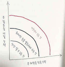높은 성과를 올리는 사람들은 '당장 할 수 있는 것', '최대한 힘을 발휘해야 하는 것' 이 두가지 단계를 간파하고 일찌감치 거부해 버린다. 평범한 성과에 안주할 생각이 없는 사람들은 처음부터 큰 질문을 던지고 가장 최고의 답변을 찾아 나선다. 탁월한 성과는 큰 해답을 필요로 한다. 해답으로 부터 최대한 많은 것을 얻고 싶다면 그것이 당신의 컴포트존 (comfort zone, 스스로 편안하다고 느끼는 범위) 바깥에 있음을 먼저 깨달아야 한다. 거기에는 산소도 부족하다. '가능성이 있는 것' 은 이미 알려진 것과 이미 행해진 것 너머에 있다. 큰 해답은 본질적으로 새로운 해답을 의미한다. 자신만의 해답을 찾고 싶다면 다른 사람들의 연구와 경험을 공부하라. 그곳은 최고의 탐색 장소다. 벤치마킹하고 트렌드를 예측하라.