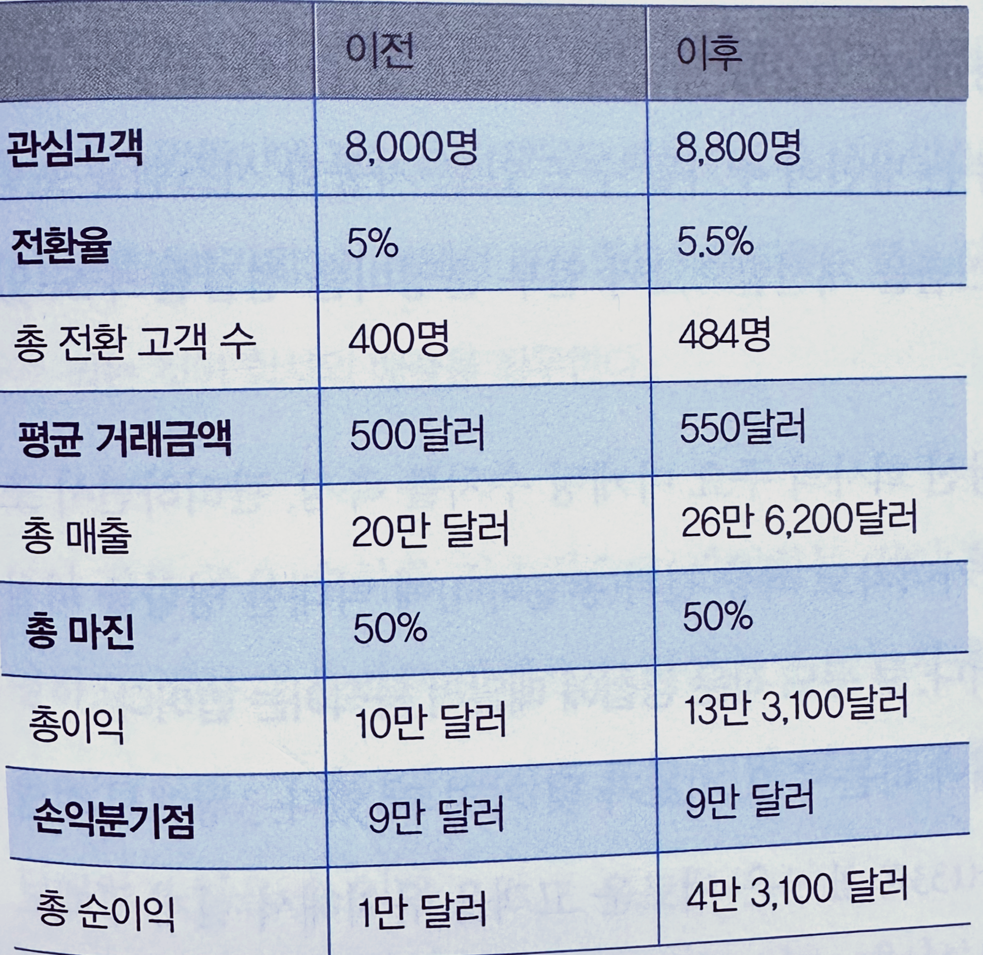 마진은 50% 그대로 유지되며 고정 운영비도 변동 없다. 위 표에서 마케팅 전 후수치를 살펴봐라.